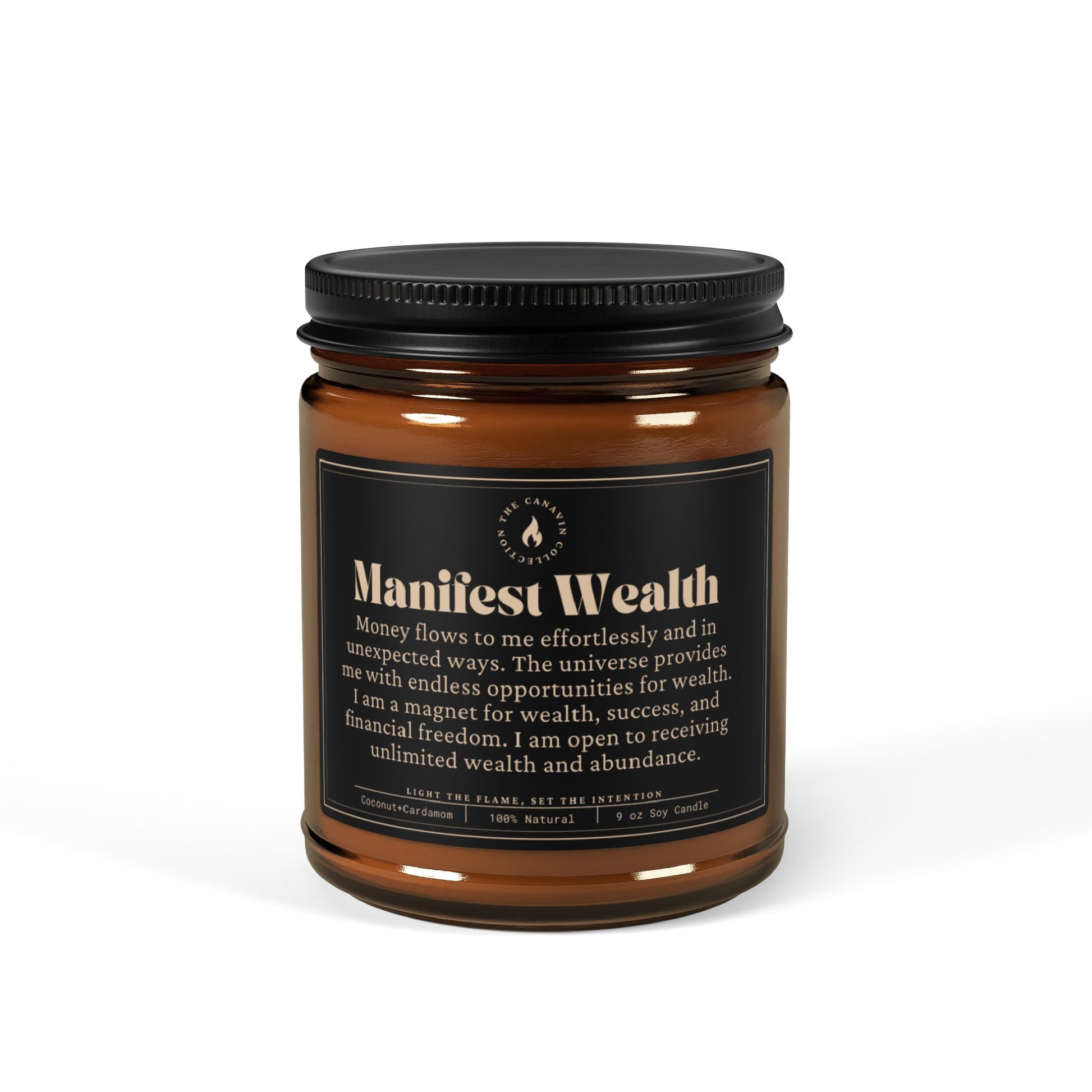 Manifest Wealth Scented Soy Candle - Abundance and Prosperity Affirmation - Amber Jar - Coconut Cream & Cardamom